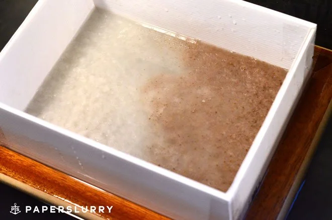Experiment with how you place the pulp and the different ways you pull the sheet (remember, there are two ways to use the deckle box). If you aren’t satisfied with the sheet, go ahead and save the pulp. These fiber blends are a great way to introduce yet another type of pulp into your deckle box, that will match the original color palette.