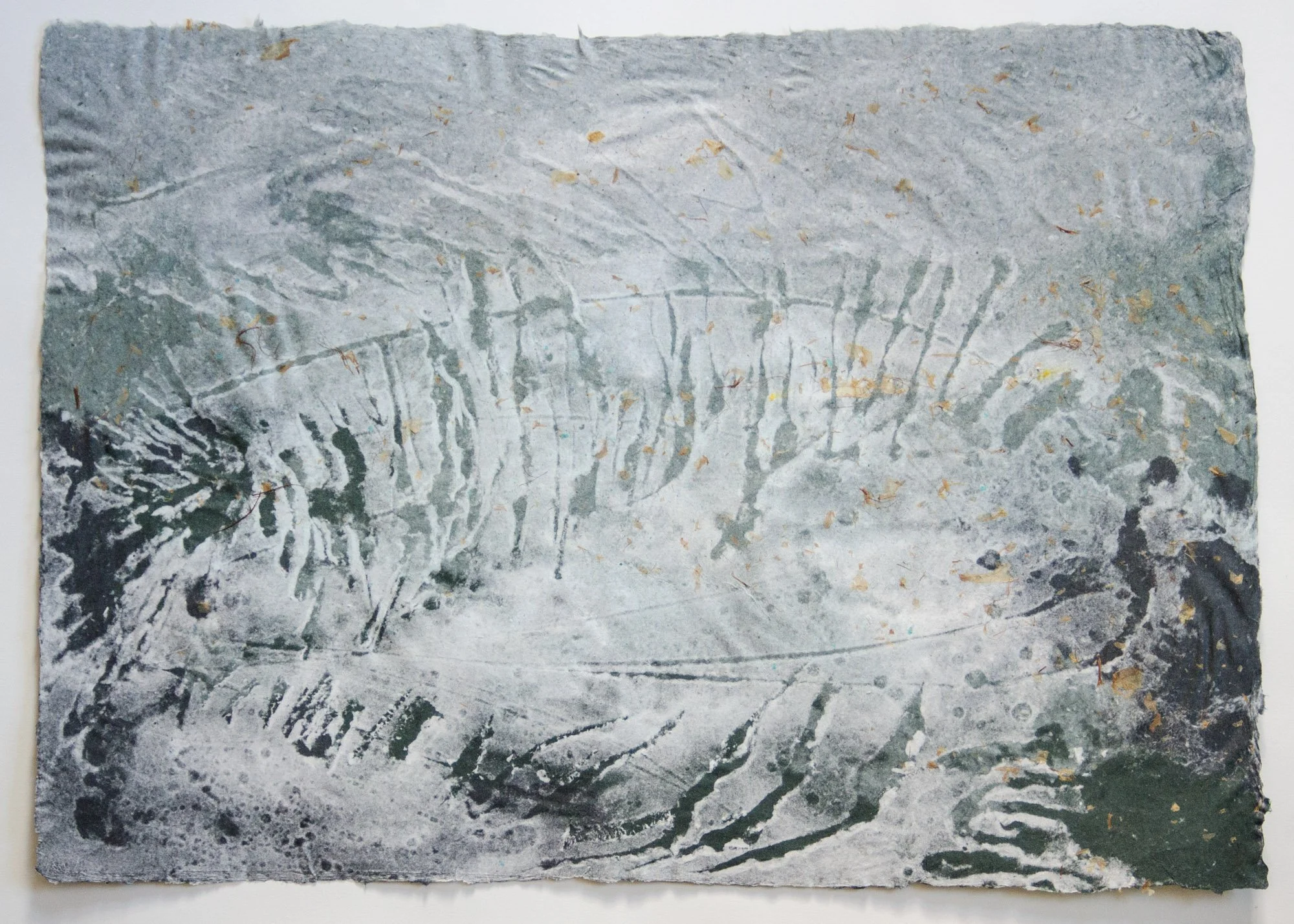 May Babcock, Living Fossils 3, abaca and gingko biloba paper pulp, 23 x 32.5 inches, 2021. This is a pulp painting that I made!!!
